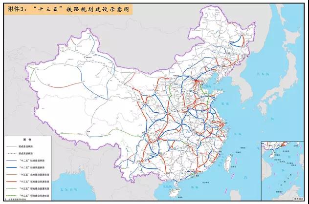 推進高速鐵路建設。加快高速鐵路網建設,貫通京哈—京港澳、陸橋、滬昆、廣昆等高速鐵路通道,建設京港(臺)、呼南、京昆、包(銀)海、青銀、蘭(西)廣、京蘭、廈渝等高速鐵路通道,拓展區(qū)域連接線,擴大高速鐵路覆蓋范圍。