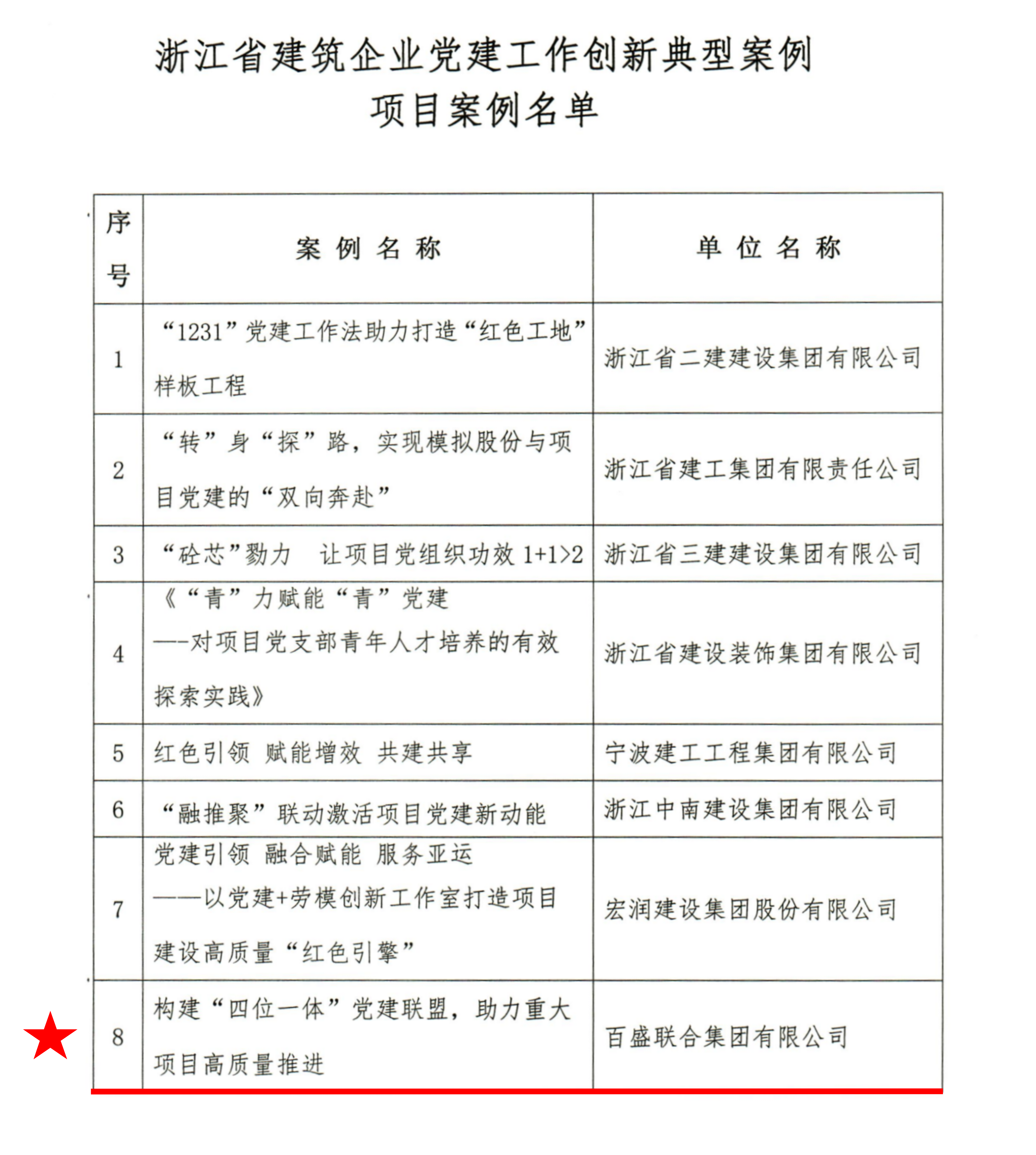 近日,由浙江省建筑業行業協會舉辦的黨建工作創新典型征集活動評選結果揭曉,百盛聯合集團報送的《構建“四位一體”黨建聯盟,助力重大項目高質量推進》成功入選項目典型案例。