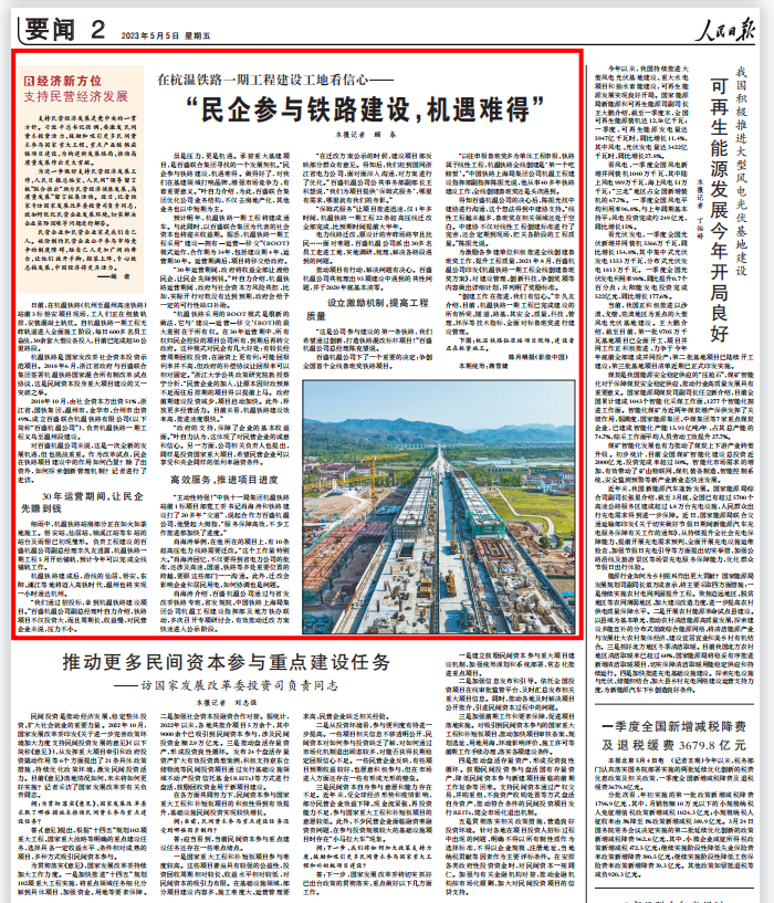 5月5日,人民日報在要聞02版,刊登了《在杭溫鐵路一期工程建設工地看信心—“民企參與鐵路建設,機遇難得”》一文,介紹百盛聯合集團參與杭溫鐵路項目這一案例。報道對杭溫改革示范意義、如何高效推進項目進度、提高工程質量等內容進行了全方位、多角度的詳細闡述。