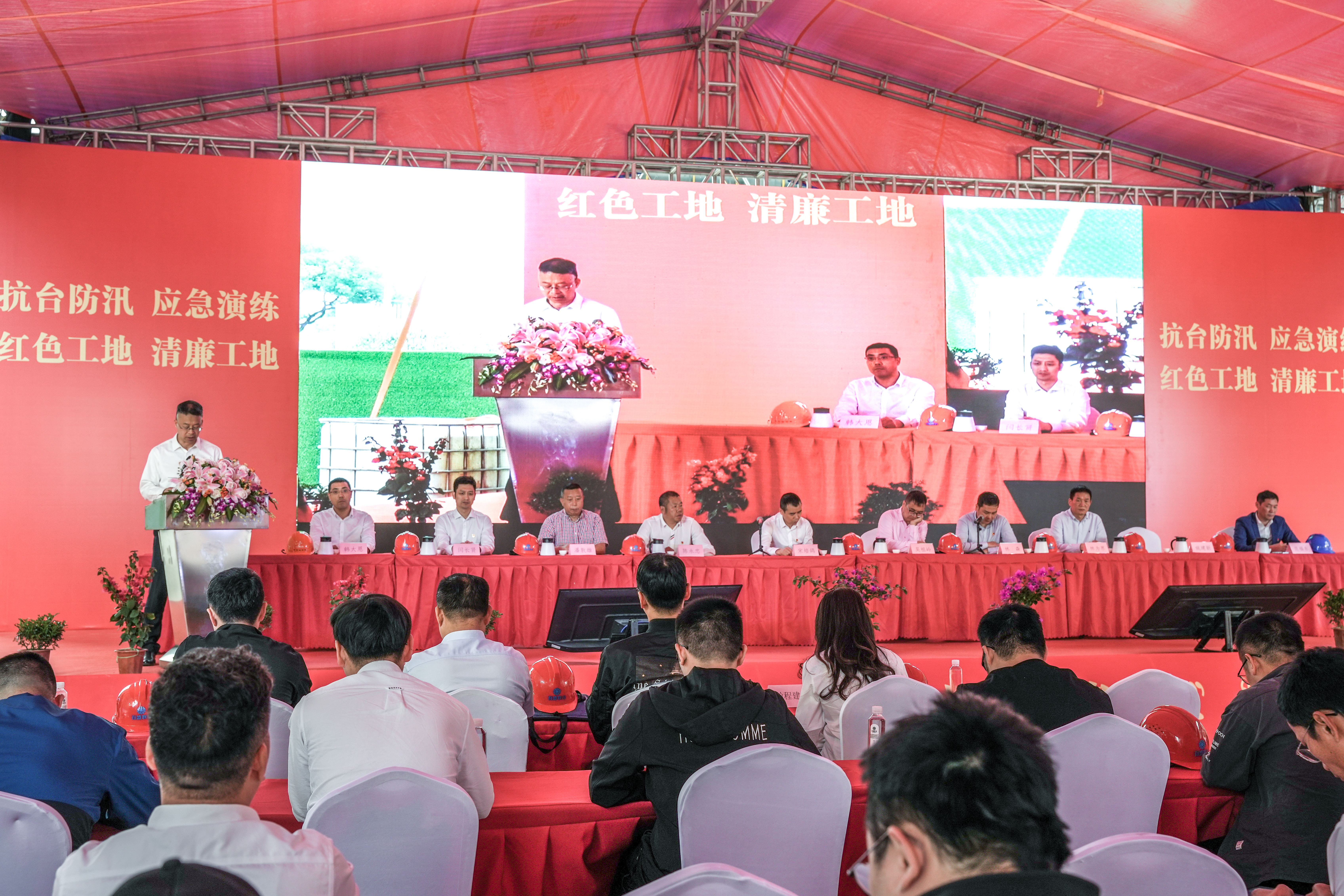 與會人員參觀了紅色工地黨建文化長廊、清廉工地文化長廊、質量工藝展示區、安全防護用品展示區等區域,并觀看了“紅色工地”“清廉工地”宣傳片、抗臺防汛應急演練紀錄片。