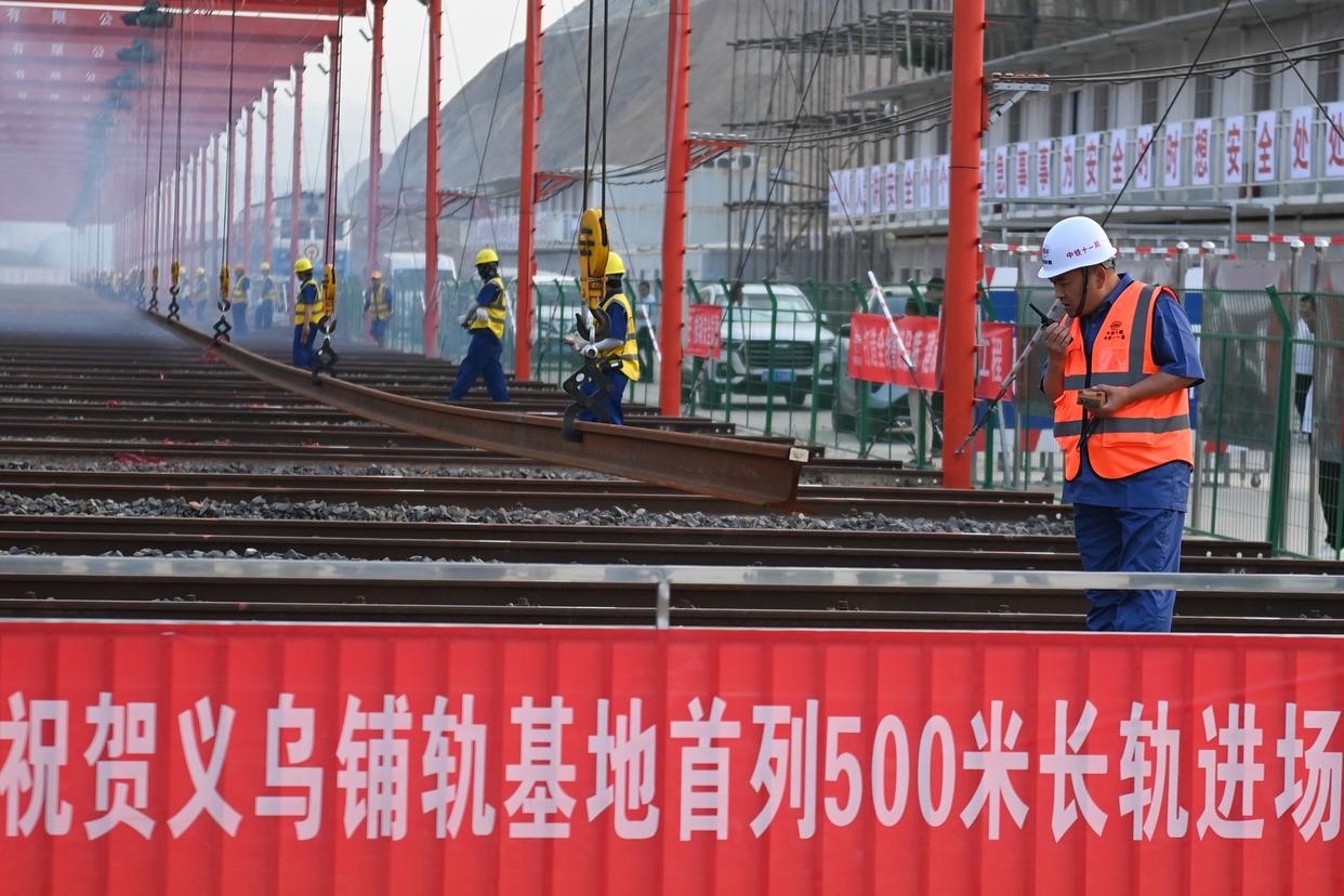 義烏鋪軌基地位于義烏高鐵站東北側,占地約84畝,基地內設有2個存軌區,負責杭溫鐵路一期、二期長軌存儲任務,最大存軌量達400公里。由中鐵十一局集團杭溫鐵路站前1標項目經理部承擔杭溫鐵路一期正線鋪軌414.827公里、站線鋪軌21.713公里的施工任務。