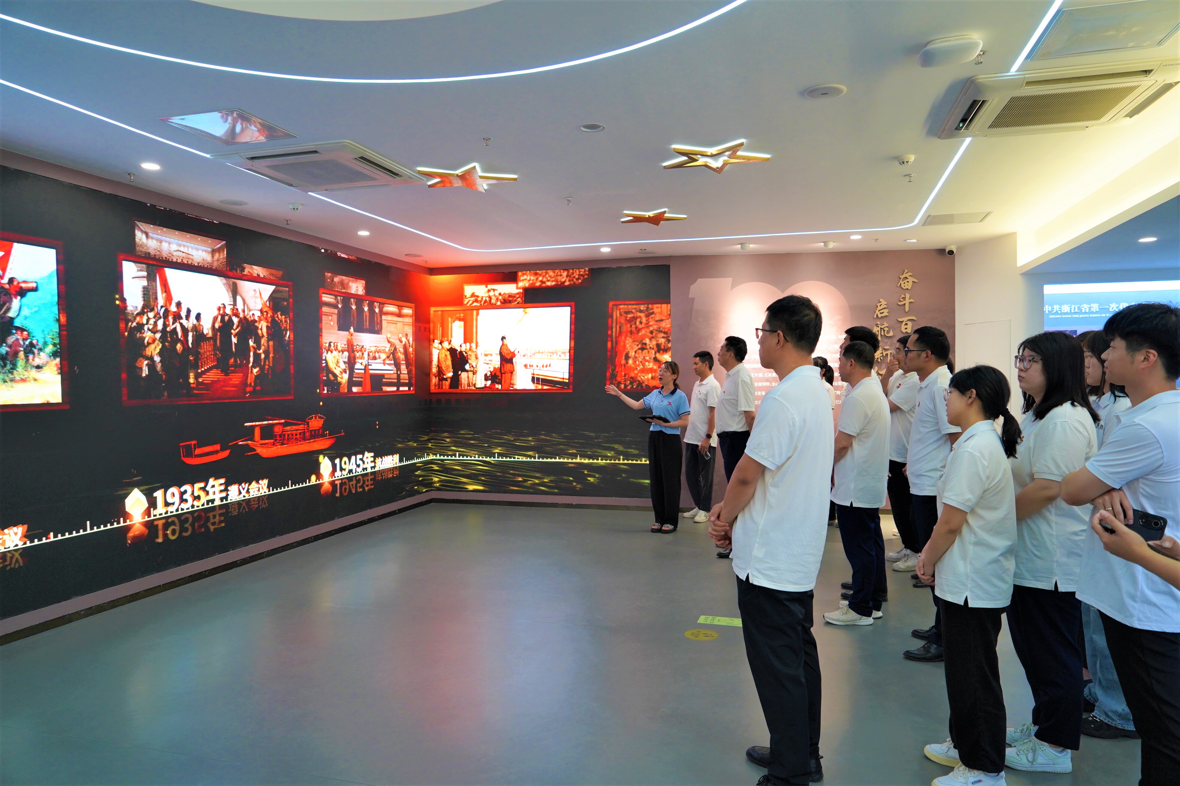 “甌江紅”黨建人才綜合體以“黨員教育、群眾服務、人才孵化、干部調適”為主要內容。在講解員的帶領下,全體黨員先后參觀了時光走廊、黨史教育館、紅色理想區、主題黨日館等特色區域。一件件文物、一幕幕影片,無不激勵著在場黨員們牢記初心使命。通過巨幅沉浸式折幕、全包圍沉浸式影像、四面高清沉浸式數字沙盤等高新技術,黨員們在這里回顧百年黨史崢嶸歲月,緬懷革命英雄。